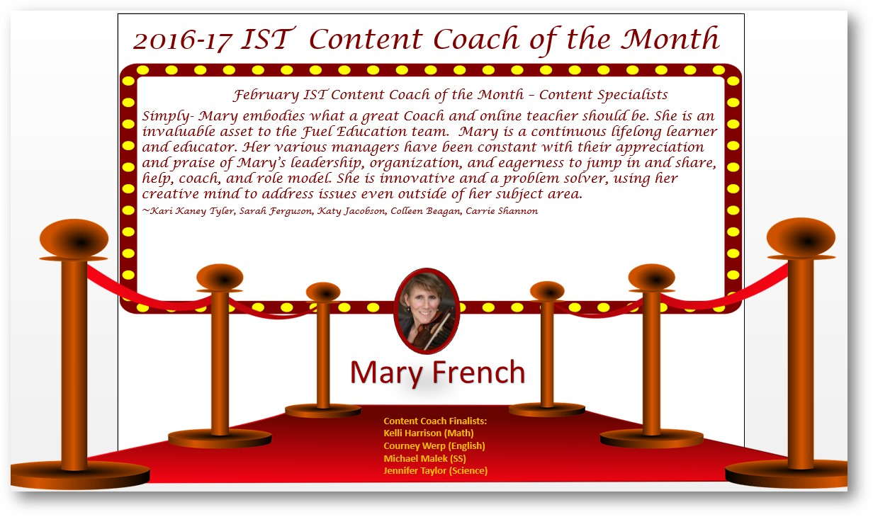 Last year I was awarded teacher and content coach of the month. This was a big honor as I was selected from a pool of 600 teachers.